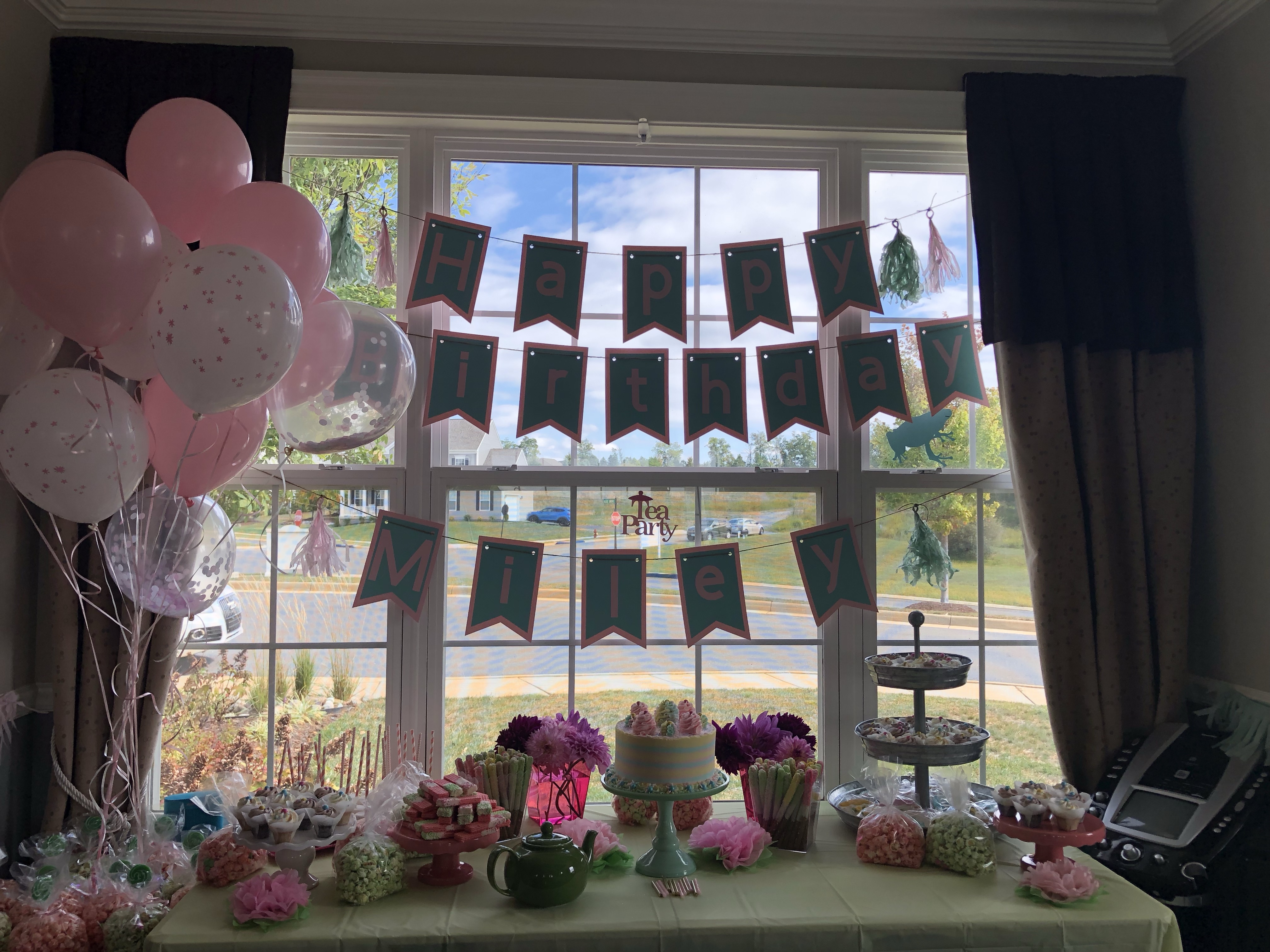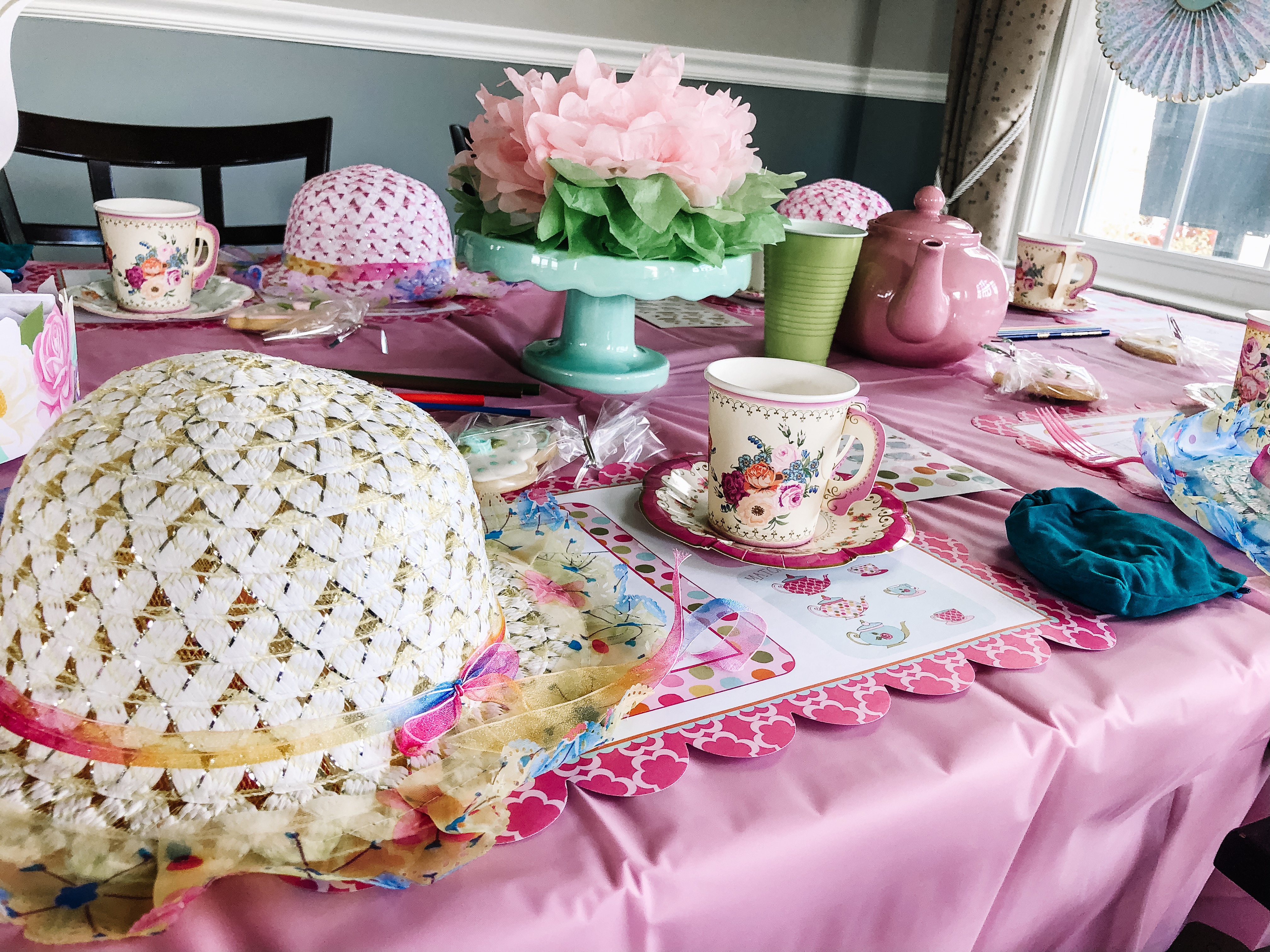 For decorations we did soft floral colors. Lots of pinks!!! I ordered some paper decorations from Amazon, along with the paper plates, straws and of course, tea cups! I found adorable paper tea cups for the kids to use. They were a hit.