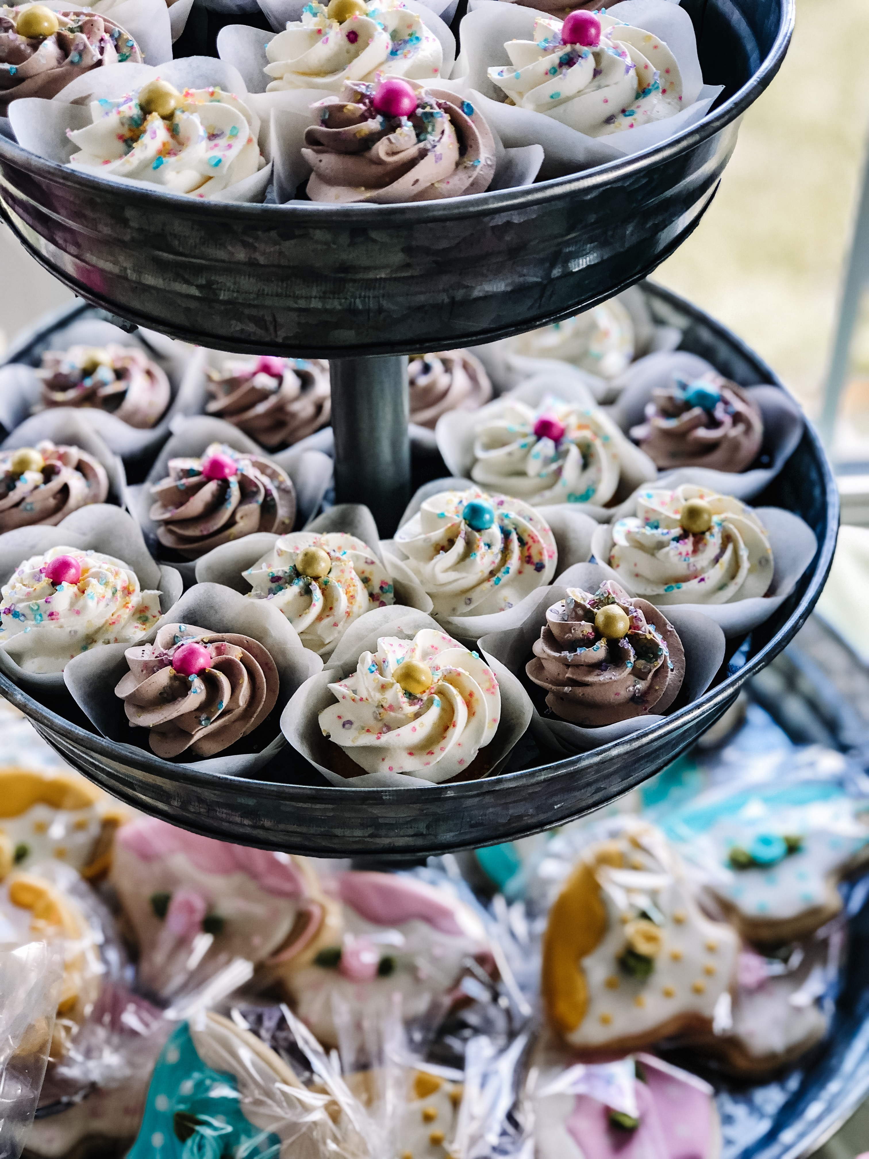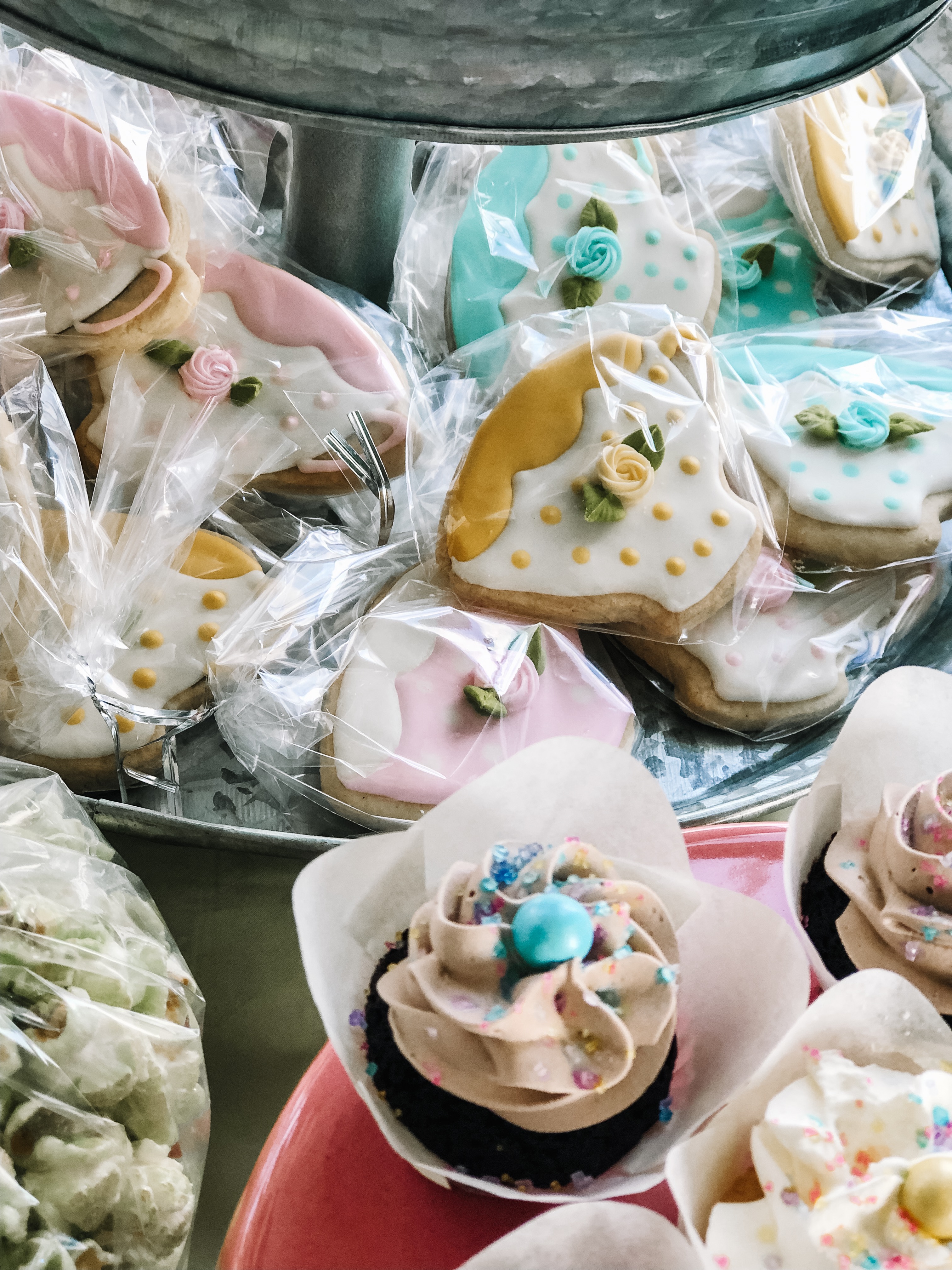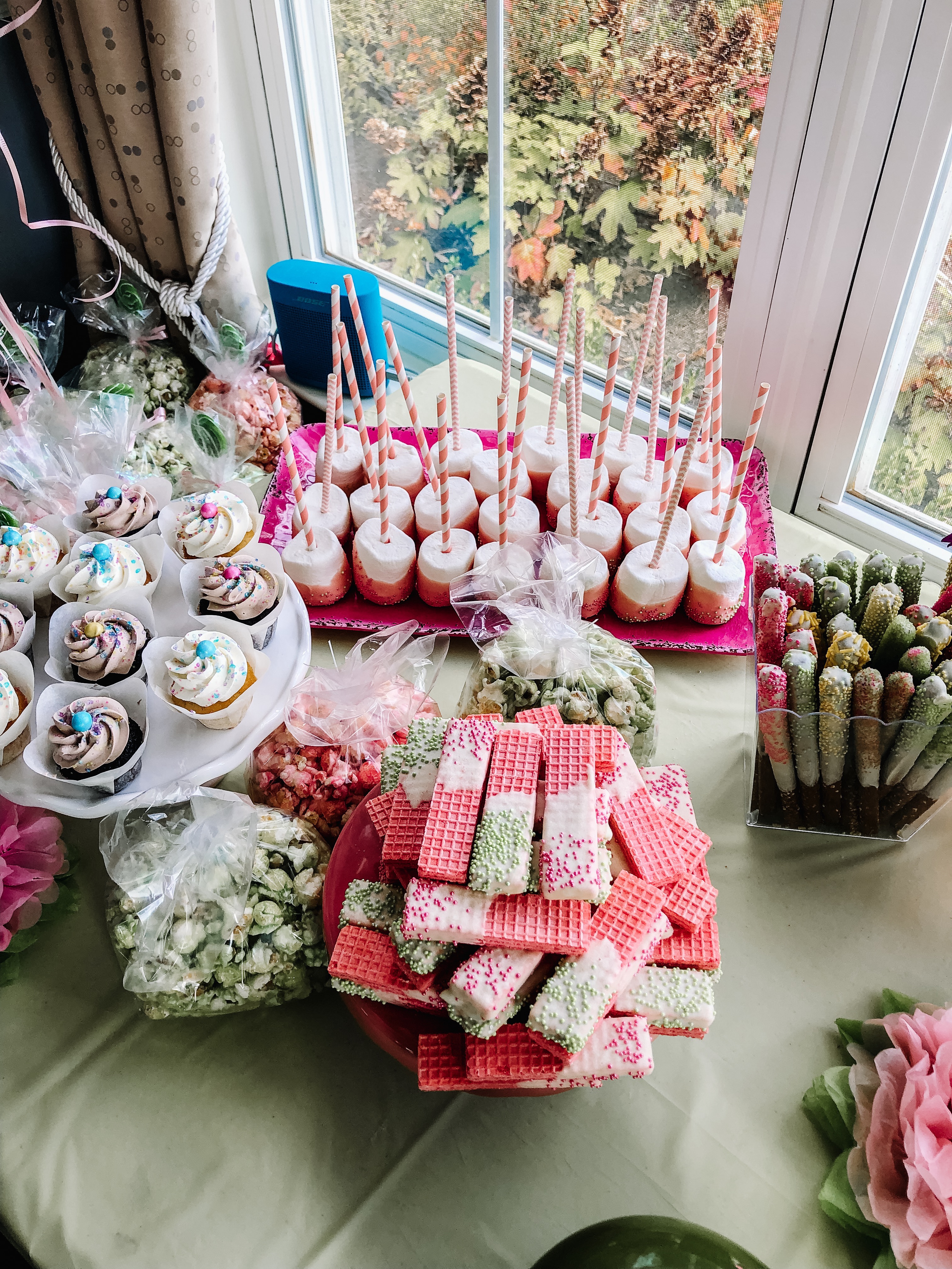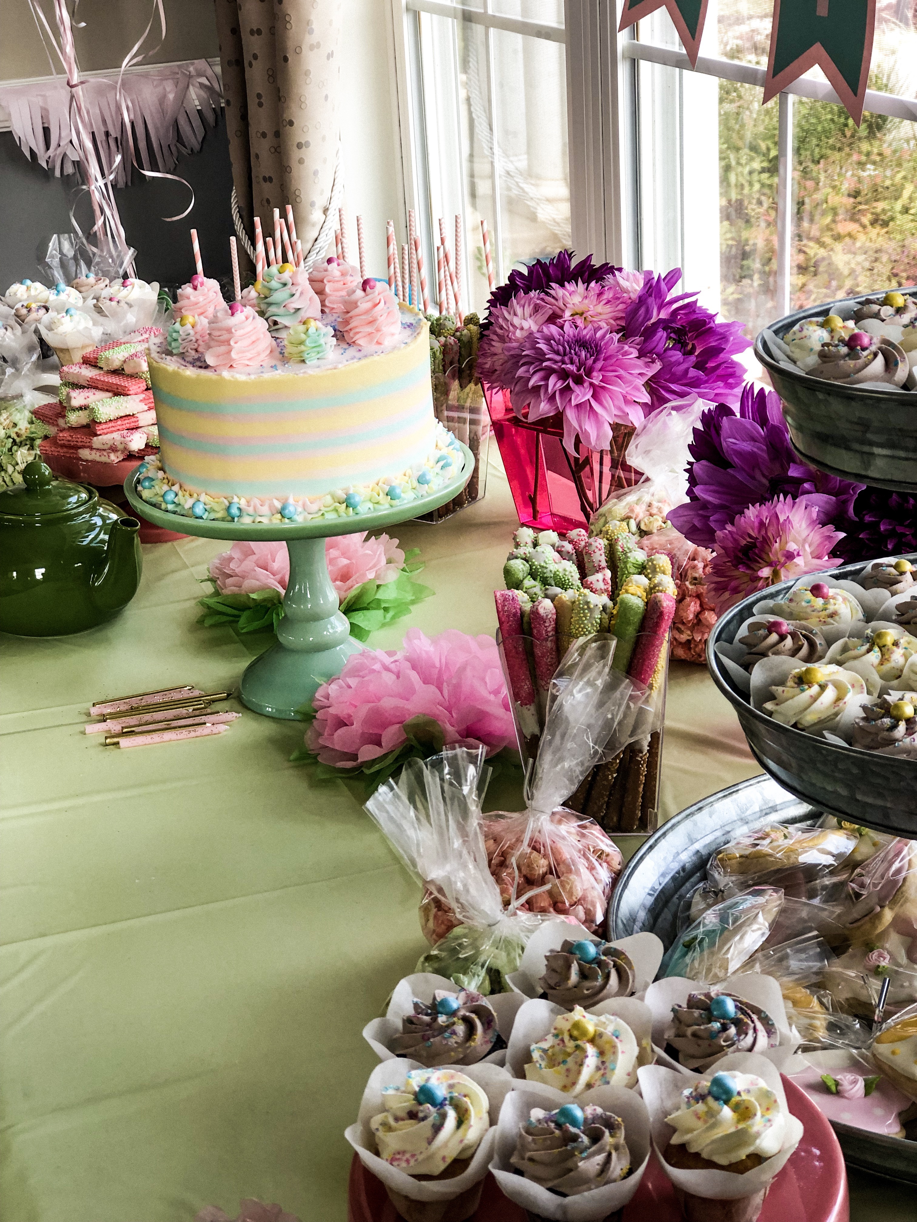 I think what made the party, for the kids, was the fact we had a desserts table. She had an amazing cake and cupcakes. There were teacup cookies. Popcorn that was flavored and colored to match the color theme of the party. Chocolate covered pretzels and marshmallows with sprinkles. Also, some cute pink cookies covered in white chocolate and sprinkles.